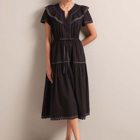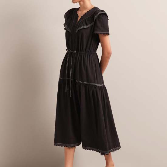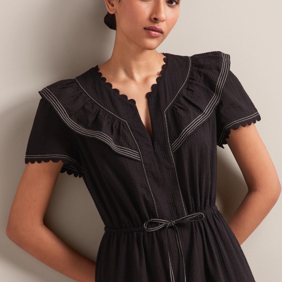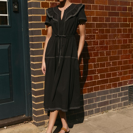 When it comes to easy;everyday dresses that can navigate the beach;sight-seeing and long;lazy lunches;you’d be hard pressed to beat Nessa. Made from our 100% cotton seersucker;it comes with a drawstring waist that can be tied to cinch or left undone for a more relaxed vibe. The pretty frill detailing;keyhole hook-and-eye and tiered skirt keep it light and airy.
