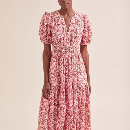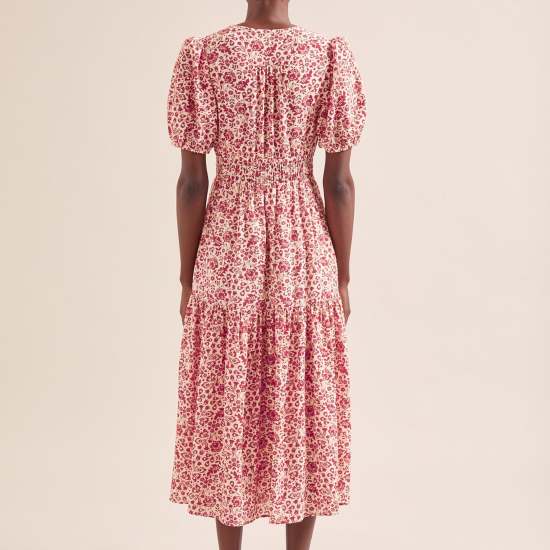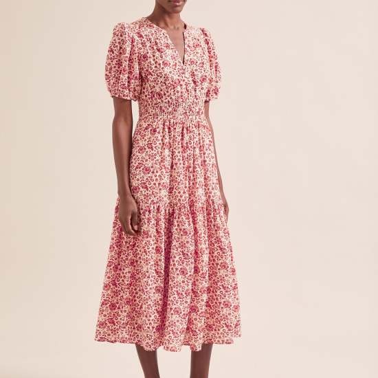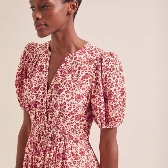 Cut in our beautifully light;soft and drapey cotton viscose voile in our latest feminine floral;Olive is a dream dress to wear. Inspired by our bestselling Evie dress;it features a nipped in ruched elasticated waist and discreet side pockets for relaxed wearability. Perfect for summery sporting events and late summer celebrations or worn casually with sandals.