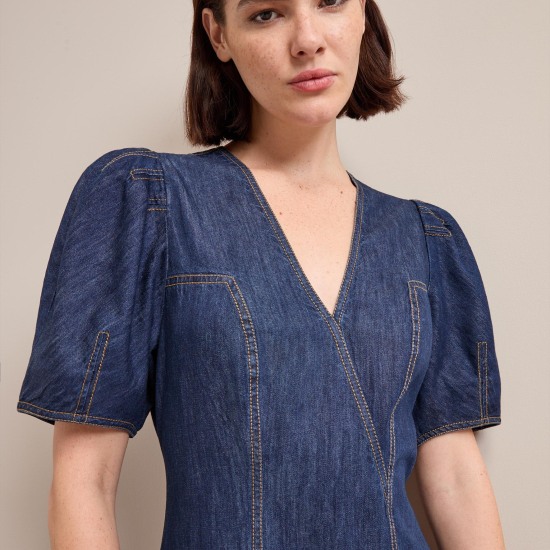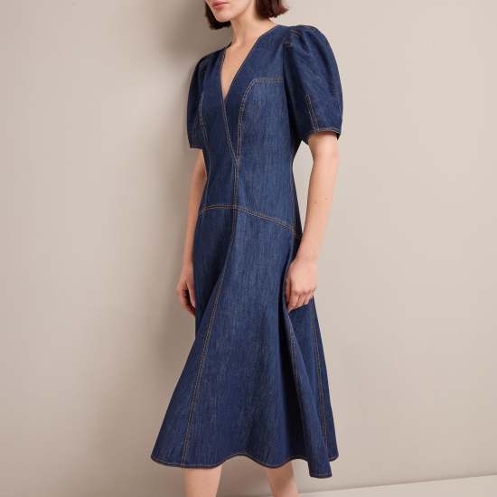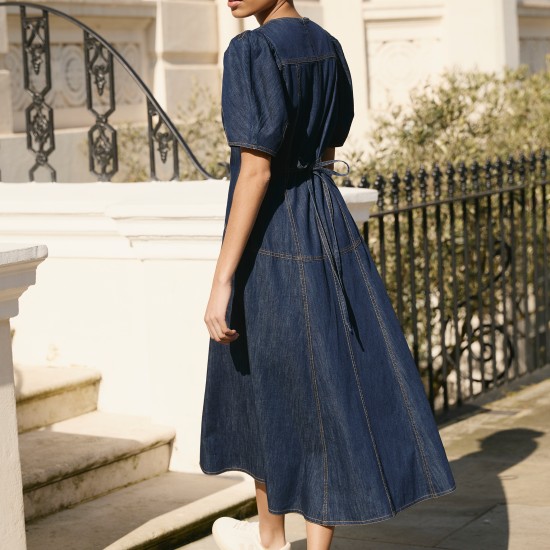 A wardrobe staple that never goes out of style;Robin is the denim dress you will wear on repeat. With an on-trend puff sleeve;considered stich detailing and fluted skirt;it can be tied at the front or back to create a flattering silhouette. Simply style with trainers or sandals and sun-bronzed legs.