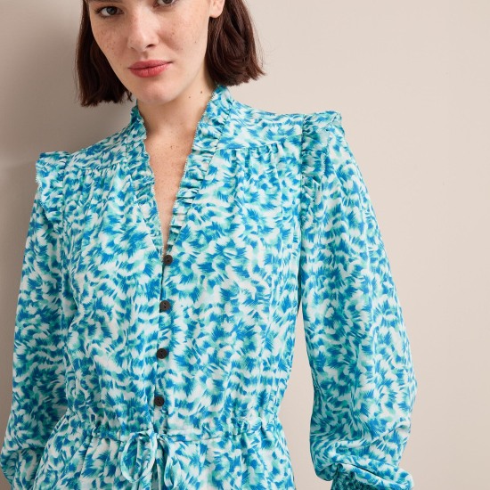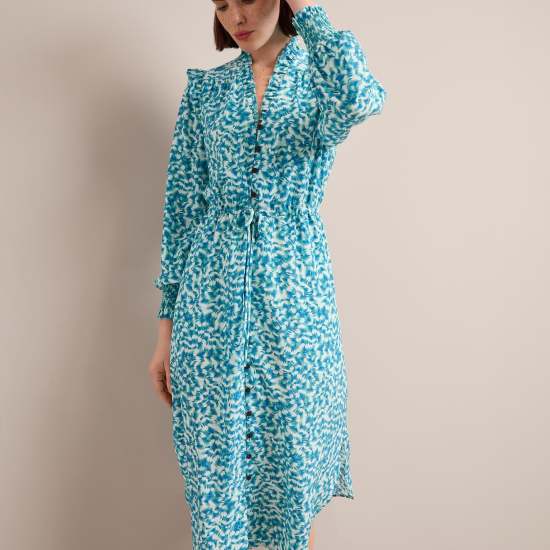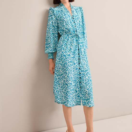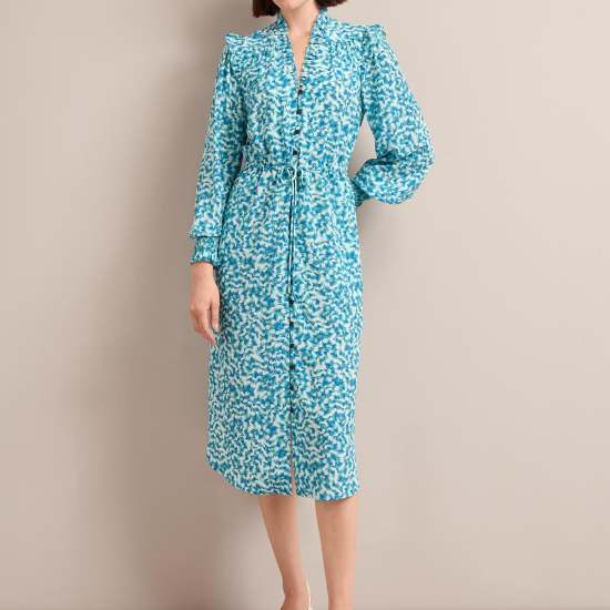 The Stella dress has earned iconic status in the Cefinn collection thanks to the combination of its easy wearability and luxe feminine detailing. Cut from 100% silk crepe de chine;it has pretty rouleau buttons;shirred cuffs;and eyelash frill edging while the adjustable drawstring waist can be cinched in or worn loose and airy for a more relaxed look. Pair with an elegant slingback or strappy heel for Ascot;summer weddings;garden parties and more.